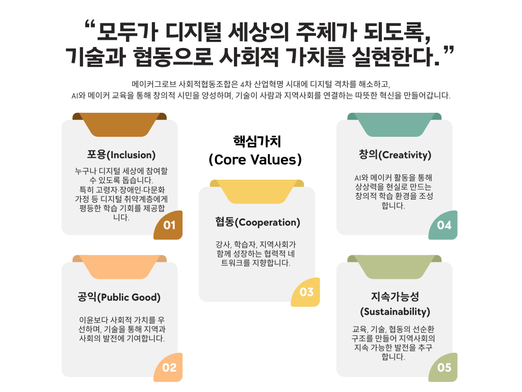 1. 포용(Inclusion) 누구나 디지털 세상에 참여할 수 있도록 돕습니다. 특히 고령자·장애인·다문화가정 등 디지털 취약계층에게 평등한 학습 기회를 제공합니다. 2. 창의(Creativity) AI와 메이커 활동을 통해 상상력을 현실로 만드는 창의적 학습 환경을 조성합니다. 3. 협동(Cooperation) 강사, 학습자, 지역사회가 함께 성장하는 협력적 네트워크를 지향합니다. 4. 공익(Public Good) 이윤보다 사회적 가치를 우선하며, 기술을 통해 지역과 사회의 발전에 기여합니다. 5. 지속가능성(Sustainability) 교육, 기술, 협동의 선순환 구조를 만들어 지역사회의 지속 가능한 발전을 추구합니다.